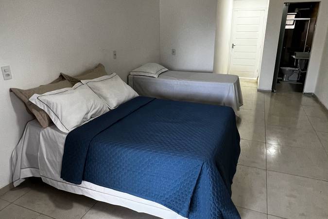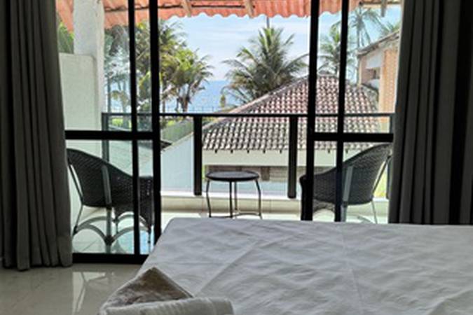 A suíte da Superior Vista Mar acomoda até 3 hóspedes em uma cama casal + uma cama solteiro. Conta com varanda privativa, mesa de apoio e cadeiras para relaxar apreciando a praia, e é bem equipada para sua comodidade.