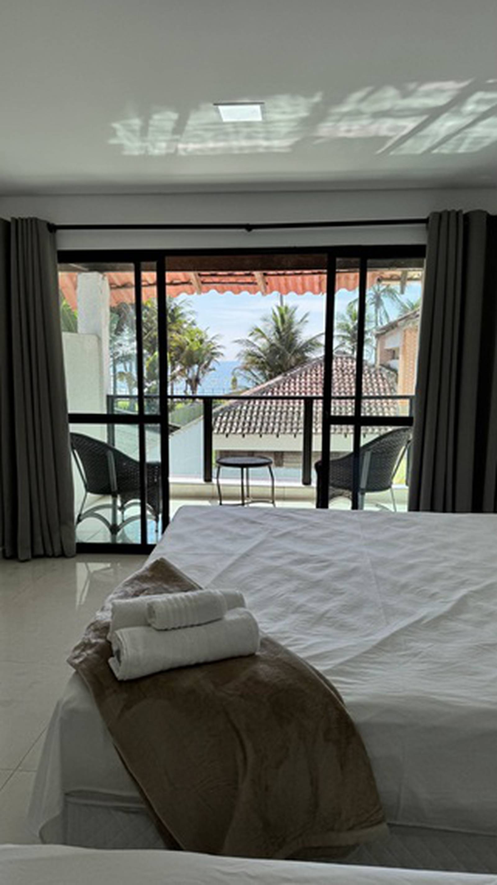 A suíte da Superior Vista Mar acomoda até 3 hóspedes em uma cama casal + uma cama solteiro. Conta com varanda privativa, mesa de apoio e cadeiras para relaxar apreciando a praia, e é bem equipada para sua comodidade.